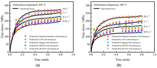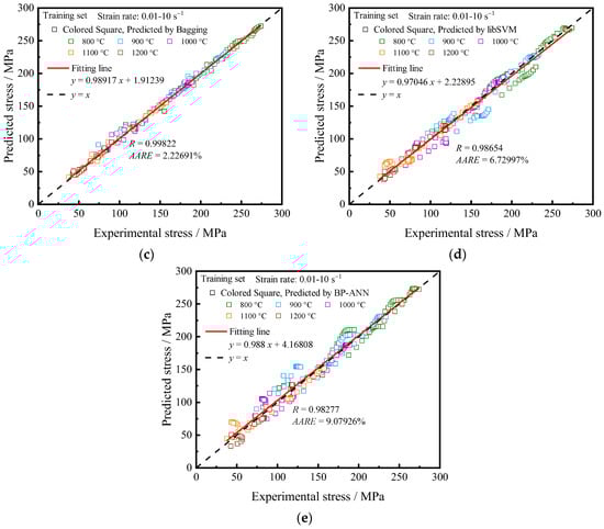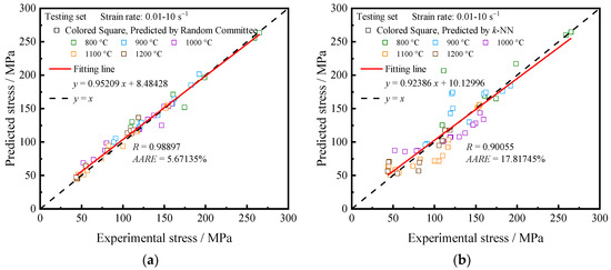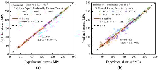 Fitting points were plotted with experimental flow stress on the horizontal axis and predicted flow stress on the vertical axis to reflect the performance of the training set [19,40]. The closer the data points are to the y = x, the higher the prediction ability of the model is. As shown in Figure 6, the data points obtained by the Random Committee algorithm mostly fall on the y = x, indicating that this method has the best predictive ability, followed by the Bagging algorithm with the second-best prediction performance, while the libSVM, k-NN, and BP-ANN algorithms display relatively poor prediction performance.