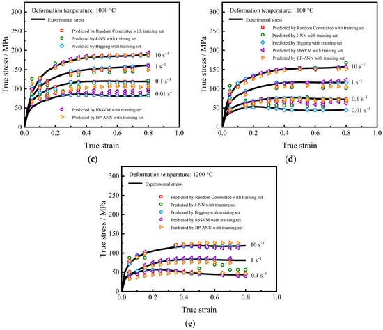 Comparison of experimental and predicted stress calculated by five algorithms on training set: (a) 800 °C; (b) 900 °C; (c) 1000 °C; (d) 1100 °C; (e) 1200 °C.