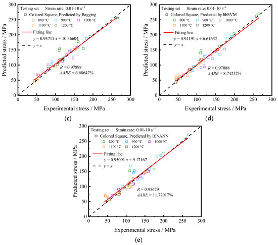 Correlation between experimental and predicted flow stress on testing set with experimental temperatures of 800–1200 °C and strain rates of 0.01–10 s−1: (a) Random Committee; (b) k-NN; (c) Bagging; (d) libSVM; (e) BP-ANN.