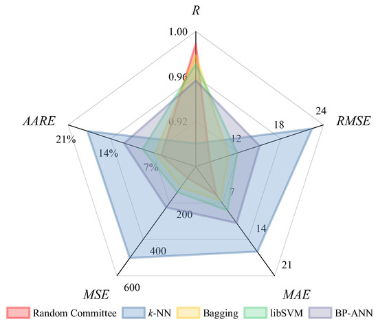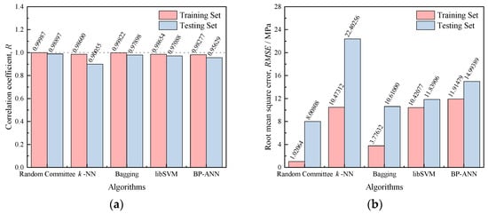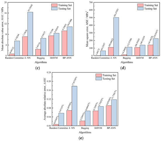 Using the evaluation metrics described in Equations (2)–(6), the comprehensive quantitative analysis for the prediction accuracy and generalization ability of the five developed machine learning models was conducted. As illustrated in Figure 9, when compared to the predictability of the remaining models, higher R values (higher than 0.97) and smaller error values (RMSE, MAE, MSE, and AARE) are obtained in both the training and testing sets for the Random Committee, Bagging, and libSVM models. Figure 9 also indicates that the invisibility of the testing set to the training process results in the evaluation metrics for the prediction results of the testing set being slightly inferior to those of the training set, and this feature is consistent across the different algorithms. Specifically, compared with the evaluation metrics on the training set, the R values of the Random Committee, Bagging, and libSVM models on the testing set decreased by 0.01090, 0.01924, and 0.01565, respectively. Meanwhile, the RMSE, MAE, MSE, and AARE values of these three models increased by 6.98743 MPa, 6.83368 MPa, and 1.41829 MPa; 4.85111 MPa, 4.11039 MPa, and 0.92623 MPa; 63.08755 MPa2, 98.31150 MPa2, and 31.57096 MPa2; and 4.99288%, 4.45956%, and 2.01255%, respectively. On the other hand, both BP-ANN and k-NN models obtain relatively high R values, with R values of 0.98277 and 0.98600 on the training set and 0.95629 and 0.90055 on the testing set, showing great linear correlation. However, the error values of these two models are relatively large, especially in the testing set, with AARE values of 11.77017% and 17.81745, respectively. This indicates that the predictive capability of BP-ANN and k-NN models is inferior to other models in this paper. Moreover, it should be noted that the libSVM model has the smallest difference in evaluation metrics corresponding to the training set and testing set, which indicates that it has the best generalization and excellent accuracy. Eventually, Random Committee, Bagging, and libSVM models obtain higher R values and smaller error values, fully demonstrating their superiority.