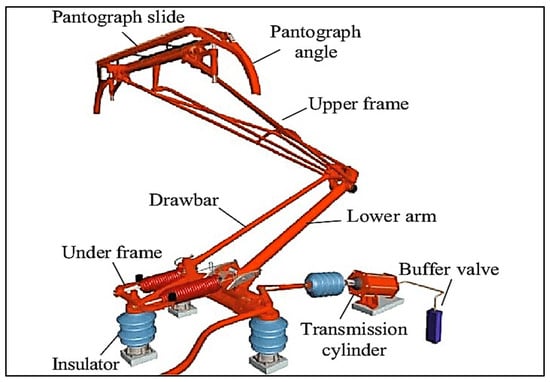Pantographs are electro-mechanical devices placed on the top of electric trains in electrified railway systems. This combination of engineering precision with electrical elegance generates a vital symbiotic bond with the overhead tension wires, giving the locomotive the necessary energy (electric power supply) to run [1]. Historically, this symbiosis has played out in a one-wire setting, with the railway track humbly supplementing the return current. The power transmission dance in modern electric rail systems consists of a catenary and a parallel-running contact wire. The pantograph acts as an intermediate conductor and, through a spring-loaded mechanism, provides a proper and high-quality connection with the contact wire. This elaborate procedure is crucial for the smooth running of the train [2]. Nevertheless, the contact shoe roller slides vertically along the wire during the movement of the train and, thus, conducts an accidental symphony, giving rise to standing waves in the wire. Nonetheless, these harmonies are disturbed by electromagnetic wave interference, disrupting the smooth flow of the electrical current. The difficulties of harmonizing pantographs in proximity within specific systems are apparent. For high-altitude electric trains, where the pantograph would operate better at higher voltage levels and interfaces with overhead wires, reliability is a focal point. Although third-rail systems have been recognized as reliable, the practical implementations usually favor pantographs. Pantographs are powered by compressed air from the braking system, with the spring acting as the extension mechanism, as shown in Figure 1.