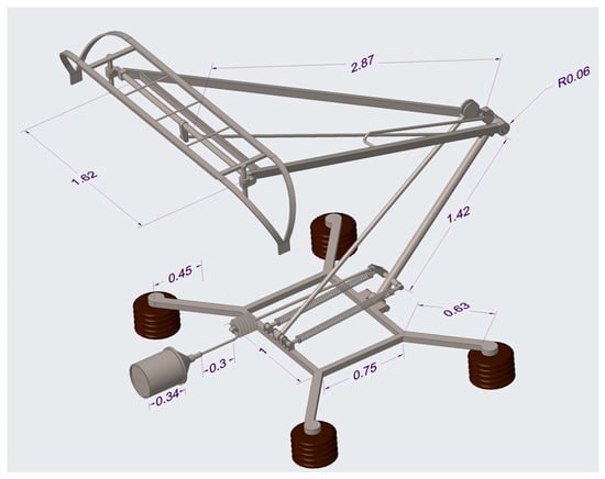 The first step in the structural analysis journey is to develop a comprehensive computer-aided design (CAD) model of the pantograph. This model is the working framework for subsequent phases. When the CAD model is created, it is then thoroughly evaluated within and through the ANSYS Design Modeler. This scrutiny is aimed at detecting and rectifying geometric errors, surface imperfections, or any other errors related to the model’s surface characteristics. The designed pantograph model, meticulously examined and refined, takes its form, as exemplified in Figure 2. The model is designed in Creo and all approximate dimensions are in meters.