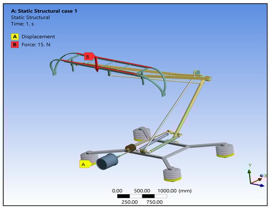 Simultaneously, a downward force of precisely 15 Newtons is applied to the pantograph slide, as vividly illustrated in Figure 4 [24]. These boundary conditions encapsulate the real-world scenarios and operational stresses that the pantograph endures.