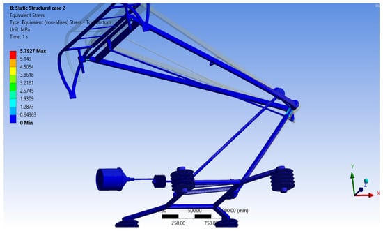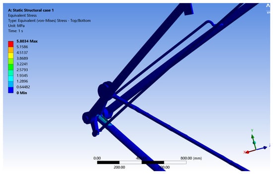 Figure 5 below shows a plot diagram for the cast-iron pantograph, through which we can derive an equivalent stress distribution. It very clearly presents the greatest value of equivalent stress concentration at the point where the upper frame and drawbar meet. The highest equivalent stress reading in this analysis is measured at 5.8034 MPa.