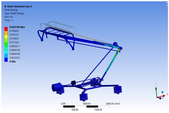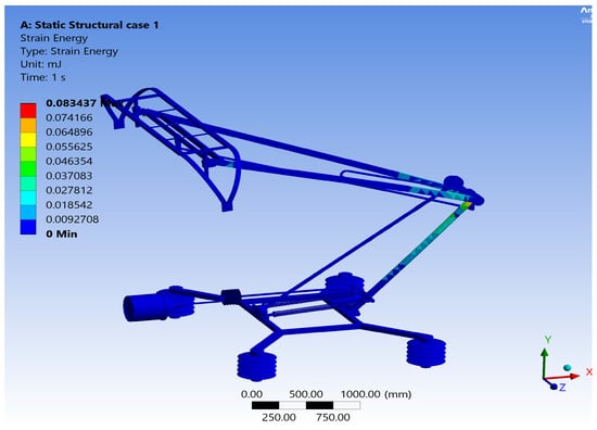 Notably, the intersection of the lower arm and upper frame exhibits significant strain energy accumulation. The maximum strain energy recorded through the analysis is 0.083 mJ, demonstrating the energy-absorbing capabilities of the material in this specific region. Similar to equivalent stress, the strain energy maintains a consistent distribution across other areas of the pantograph.