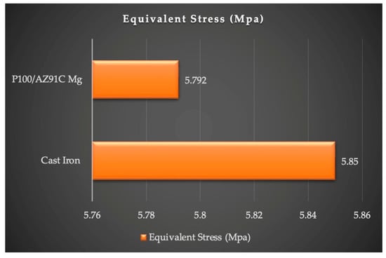 Further enriching our exploration, Figure 11 presents the Equivalent Stress Comparison Chart. Here, we observe a fascinating aspect—the P100/AZ91C Mg MMC pantograph exhibits lower equivalent stress levels when compared to its cast iron counterpart, opening the doors to a plethora of potential applications.