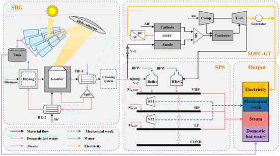 The energy supply system proposed in this paper primarily consists of a solar-driven biomass gasification system (SBG), solid oxide fuel cell–gas turbine system (SOFC-GT), steam power system (SPS), and throttle valves. Figure 1 illustrates the flowchart of the SBG-SOFC-GT-SPS system. The proposed energy system relies on renewable energy sources (biomass and solar) to fulfill the requirements of the utility system. Each subsystem will be described in detail below.