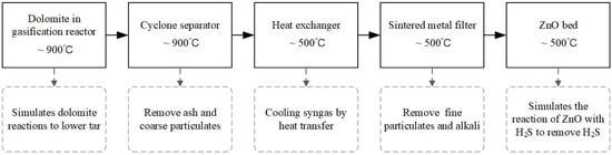 The cooled syngas enters the cleaning system to remove possible particles, fly ash, and sulfur compounds. The specific steps of the syngas cleaning system are illustrated in Figure 2. Firstly, a high-temperature reaction is simulated in the gasifier using dolomite to reduce tar. Fly ash and coarse particles are then removed through a cyclone separator. The syngas is subsequently cooled through heat exchange to a temperature suitable for further cleaning (~500 °C). Sintered metal filters are employed to remove fine particles and solid by-products. Finally, a zinc oxide bed is used to eliminate H2S, resulting in clean gas. The clean syngas is divided into two streams: one enters the SOFC controlled by valve V−1, and the other enters the SPS controlled by valve V−2.
