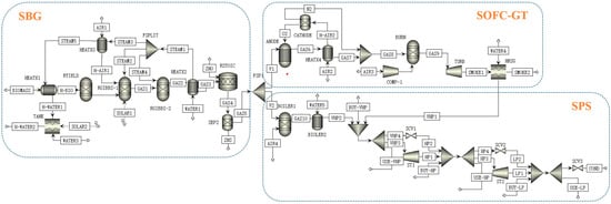 Process flow of the proposed SBG-SOFC-GT-SPS system using Aspen Plus.