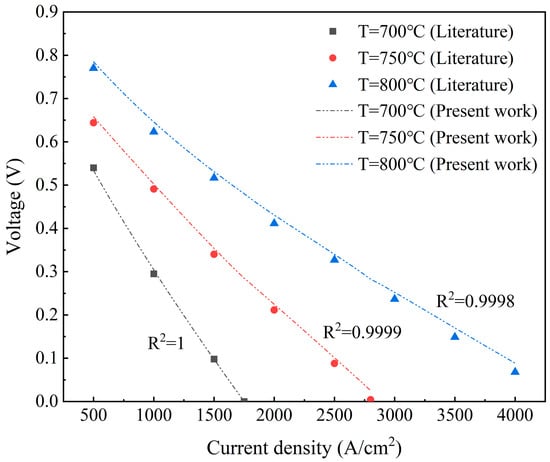 where (K) and (bar) are the average temperature and partial pressures, respectively, which are the average values of the inlet and outlet gas flows in and out of the anode and cathode. R is the molar gas constant with a value of 8.3145 J/(mol∙K). F is Faraday’s constant, 96,485 C/mol.
