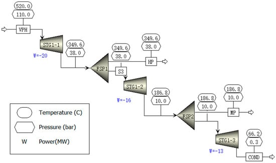 Figure 16 depicts the SPS simulation results of a steam network system with the goal of obtaining the maximum energy efficiency (rv1 of 0.4). The graphic fully displays the input and output parameters for each operation. In this instance, the heating of the system is dominant. The ST1 and ST2 steam turbines have respective output shaft powers of 4.23 MW and 1.16 MW. The temperature and pressure reducer achieves cooling and decompression by releasing high-temperature and -pressure fluids into the environment. While this process is crucial for the system’s safety and protection, some of the fluid’s heat and kinetic energy will be lost, leading to waste and energy loss. Therefore, we minimize the use of temperature and pressure reducers during the modeling process, and the excess steam is passed into STs in order to reduce the energy loss.
