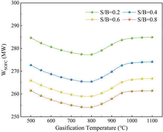 - By studying the influence of system operating parameters, it is observed that the output power of the SOFC can be enhanced by maintaining a low S/B ratio and a high gasification temperature. Specifically, the maximum SOFC power is reached at a gasification temperature of 950 °C and an S/B of 0.2. Additionally, increasing the operating temperature of the SOFC contributes to an increase in its voltage and output power, but after 950 °C, this growth trend slows down.