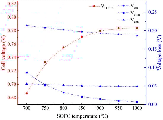 In recent years, there has been increasing concern about the utilization of synthetic gas generated through biomass gasification. Various proposals have been presented over the last decade aimed at enhancing the performance of biomass gasification systems by integration with fuel cells []. Among these proposals, solid oxide fuel cells (SOFCs) have distinct characteristics due to their high efficiency, fuel flexibility, low emissions, silent operation, and suitability for distributed energy applications []. SOFCs are efficient energy conversion technologies that directly convert chemical energy into electricity, without being limited by the Carnot cycle. Shayan et al. [] conducted a study on the economic performance of a biomass gasification–SOFC system under two different gasification agents: steam and air. Their results demonstrated that using steam as a gasification agent resulted in the best operating condition, leading to the payback period being shortened by 1 year. Wang et al. [] evaluated the economics of a biomass gasification and solid oxide fuel cell CHP system, which demonstrated superior performance with lower emissions under various operating conditions. The system achieved an energy efficiency of 59% with a payback period of 10 years. The current operating temperature of SOFCs ranges from 600 to 1000 °C [], which aligns with the operating temperature of gasifiers. The exhaust gas of SOFCs contains a large amount of waste heat that can be effectively utilized by other subsystems to form an efficient cogeneration system. Consequently, researchers have begun to explore further applications of SOFCs. Kumar et al. [] designed a cogeneration system integrating SOFCs, a gas turbine, absorption refrigeration, and the organic Rankine cycle and presented a thermoeconomic analysis. Their results show that the system achieves a waste gas recycling efficiency of 68.79%, and the cost of electricity per unit power output is 1939.93 USD/kW. Fu et al. [] designed a fuel cell multigeneration system based on biomass gasification and comprehensively evaluated different system configurations in terms of energetic, economic, and environmental aspects. They concluded that the integration of biomass gasification, a fuel cell, and a gas turbine achieves the best comprehensive performance. The above studies confirm the feasibility and promise of coupling SOFCs with biomass gasification, as well as their integration with other forms of power generation in terms of economic and other aspects.