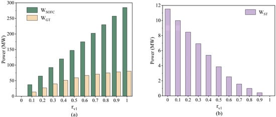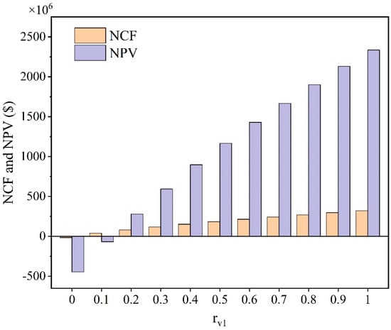 The system capital expenditure remains constant under different configuration strategies, while the NCF varies with the opening of valve V−1, as illustrated in Figure 14. The system income varies along with the heat-to-power ratio of the output due to the varied valve openings. The Figure 14 shows that the NCF has a positive correlation with rv1 and rises as rv1 increases. The NPV indicates the system’s investment income during its lifetime, and the system is economical only when the NPV is positive. The NPV is negative at rv1 of 0 and 0.1, since in both cases, a large amount of syngas leads to the SPS system producing steam and a small amount of mechanical work, resulting in less benefit than the SOFC-GT system in terms of the production of electricity. When rv1 is 0.2~1, the NPV of the system is positive, and the maximum value is USD 2.334 billion when rv1 is 1. However, in actual operations, rv1 can change with changes in demand. By calculating the NPV of the system when rv1 is [0,0.1,0.2], it is found that when the time proportion of rv1 at 0 or 0.1 does not exceed 86.7% of the system’s running time, the NPV is positive during the life cycle. Therefore, as long as the system does not keep the V−1 valve open at 0 or 0.1 for more than this time, the system will be beneficial, and it will increase with the increase in the V−1 opening.