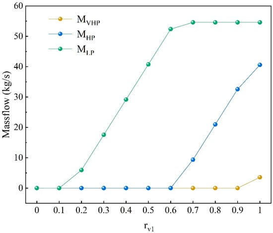 - The system simulation model is established using Aspen Plus V11, a chemical process simulation software. In this simulation model, a variable efficiency model is employed for the turbine. Unlike the constant efficiency model [,], the influence of load variation on equipment efficiency is considered.