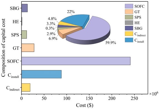 The viability of the SBG-SOFC-GT-SPS system can be evaluated in terms of the net present value (NPV) and levelized cost of electricity (LCOE). For the economic assessment, the total cost is calculated by adding the total direct cost and the total indirect cost of the system. Direct costs include equipment purchase costs and installation costs. The installation includes steel structures, painting, and piping. Indirect costs include engineering/consulting and construction costs. The formula for calculating the project capital expenditure is as follows: