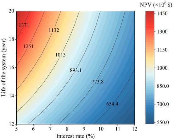 In order to further explore the relationship between the system parameters and economy, the maximum energy efficiency rv1 of 0.4 is selected as the annual operation configuration. Figure 15 shows the impact of interest rate i and system life n on the economy. The results show that increasing the interest rate and reducing the system life will reduce the NPV. When the i is raised from 5% to 12%, the NPV dropped by 50.88%. Conversely, when the system life is extended from 12 to 20 years, there is a maximum increase in the NPV of 57.92%.
