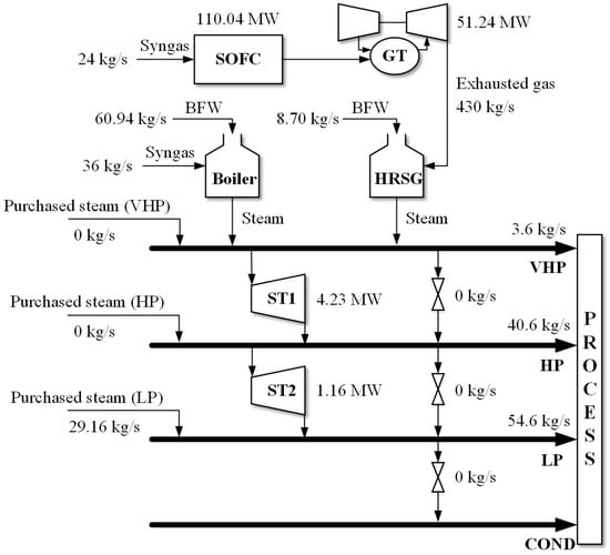 The SPS system has three steam pressure classes: low pressure (LP), high pressure (HP), and very high pressure (VHP). Every grade of steam is extracted and utilized for heating utility systems. Syngas, the main fuel for the SPS, enters the gas boiler (GB) via V−2 to generate VHP steam. Steam turbines (STs) are installed at each steam header in the SPS system to provide mechanical work. The transfer of the steam mass flow between different pressure levels is regulated by the temperature and pressure reducers. Additionally, Mp stands for purchased steam, which is utilized to supplement steam requirements at different pressures.