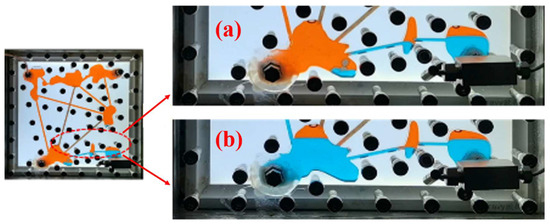 Figure 14b shows the extraction effect of the water drive process when the foam and particles are co-injected. The injection end 3 injected 30 mL (0.25 PV) of foam and 10% volume fraction of particles at a rate of 3 mL·min−1. Under the influence of gravity and the precipitation of surface activators, the solid particles gradually separate from the foam system and descend slowly. As these particles settle, they will form a stable block at the bottom of the cavern and the entrance of the fracture; they create a plugging that inhibits the channeling of bottom water. The area marked with a red circle in Figure 12 represents the accumulation of particles.