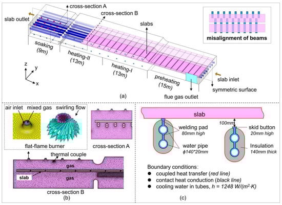 Figure 1c shows the contact heat conduction model between beams and the slab. A water-cooled beam consists of two water pipes welded together. The height of the skid button is 20 mm, and the height of the welding pad is 80 mm. The contact material between the slab and the skid button is air, and the thickness is 0.00001 m. Coupled heat transfer boundaries are specified between the outer surface of beams, slabs, and high-temperature flue gas. The heat transfer coefficient of the inner wall of the water pipes is 1248 W/(m2·K). The center cross-section along the furnace length is symmetrical. The furnace lining is a mixed heat transfer boundary condition. The wall thickness is 0.486 m, with a thermal conductivity of 2 W/(m·K). The air nozzles and gas nozzles of the burner are mass flow inlet boundaries with concentric circle structures. The typical fuel mass flow rates of the heating-I zone, heating-II zone, and soaking zone are 0.8, 1.0, and 0.3 kg/s, respectively. There is no swirl flow in the straight flame burners. The air swirl angle of the flat flame burners is 45 °C. The fuel is a mixed gas, in which the volume fractions of H2, O2, CO, CO2, H2O, CH4, and N2 are 29.57%, 0.02%, 17.18%, 10.31%, 3.01%, 14.03%, and 25.88%, respectively. The flue gas outlet is located at the side wall of the slab entry in the furnace and is set as the pressure outlet boundary condition.