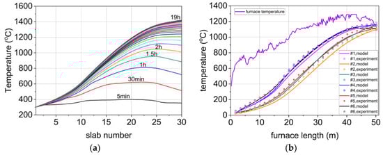 The variation in the average temperature distribution of the slab in the furnace is shown in Figure 3a. The horizontal axis is the number of slabs in the furnace. When the temperature distribution of the slabs along the furnace length is stable, the model is considered convergent. It takes about 19 h from the slab charging at room temperature until the whole furnace state reaches stability, consistent with the actual heating process. In order to verify the accuracy of the numerical simulation results, an industrial experiment was carried out to track and measure the billet temperature. Figure 3b compares the simulated and measured temperature data. The rising trend of the two data sets is basically the same and accurately reflects the temperature change of the slab heating process.