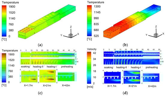 Figure 4a,b illustrate the temperature distributions of the medium in the furnace and furnace wall, respectively. The maximum temperature of the medium is approximately 1900 °C. The maximum temperature of the furnace wall is about 1300 °C. The flat flame burner creates a circular flame that spreads on the top of the furnace in the soaking zone and equalizes the temperature of the slab. The conventional burner in the heating zone forms a long, steady flame and plays a major role in heating the slab. The furnace wall temperature shows a significant step change along the furnace length due to the change in fuel mass flow rates in each zone. The temperature distribution of typical sections is shown in Figure 4c. Both flue gas and slab temperatures are lower near the flame, as demonstrated by the section of x = 21 m, because the flame is not fully spread out and is blocked by the water-cooled beams. Figure 4d shows that the flue gases are collected in the preheating zone, leading to a strong convective heat transfer effect with slabs. The flue gas temperature leaving the furnace is approximately 780 °C.