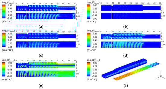 The entropy generation distribution of different thermal processes. (a) Conductive and convective heat transfer; (b) viscous dissipation; (c) mass diffusion; (d) combustion; (e) radiative heat transfer in the medium; (f) radiative heat transfer on the solid surface.