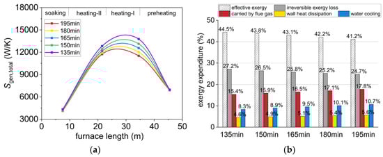 The typical fuel mass flow rates of the heating-I, heating-II, and soaking zones are 0.8, 1.0, and 0.3 kg/s, respectively. The residence time in the furnace is 150 min, and the charging temperature is 25 °C. Keeping the other conditions unchanged and adjusting the residence time to 135, 150, 165, 180, and 195 min, respectively, the changes in entropy generation and exergy efficiency are shown in Figure 8a,b. As the slab residence time decreases, the discharge interval of the slab is short, and the steel heating curve will shift downward. The energy level difference between the high-temperature flue gas and the low-temperature slab increases and leads to a deterioration in the heat transfer state. The irreversible exergy losses in the furnace increase by 2.5%, while the exergy losses due to exhaust flue gas and heat dissipation are reduced by 5.8%. Thus, the total exergy efficiency of the furnace decreased by 3.3%. In addition, production also reduced from 330 t/h to 280 t/h. Therefore, fast-paced production is one of the main ways to save energy for the reheating furnace.