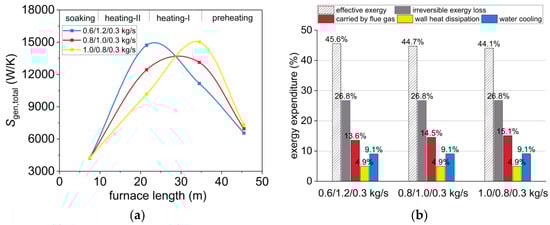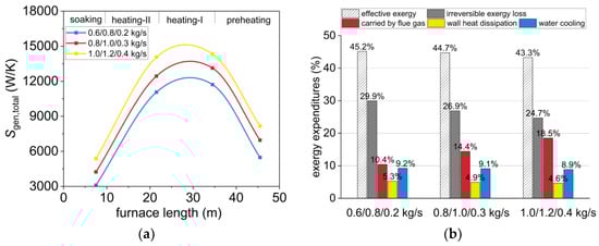 Similarly, keeping the total fuel supply of the whole furnace at 2.1 kg/s unchanged, adjusting the fuel flow distribution of the heating-I, heating-II, and soaking zones to be 0.6/1.2/0.3 kg/s, 0.8/1.0/0.3 kg/s, and 1.0/0.8/0.3 kg/s respectively, the changes in entropy generation and exergy efficiency are shown in Figure 10a,b. The variation in fuel allocation affects the entropy generation distribution in each zone, but the total entropy generation is almost unchanged. The proportions of exergy losses caused by irreversible processes, water-cooled, and wall heat dissipation are also unchanged. However, when the fuel flow rate in the preheating zone is high, the exergy loss taken by exhaust flue gas increases by about 1.5%. The furnace gaseous efficiency will decrease by 1.5%. Even the recovery rate of the flue heat exchanger can be 100%, only to ensure that the exergy efficiency does not decrease. Therefore, increasing the fuel mass flow rate in the preheating zone while decreasing it in the heating zone will cause more energy consumption.