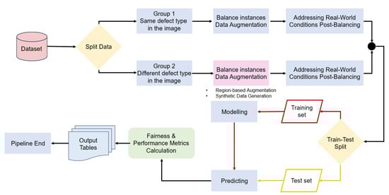 The main proposition and contribution of this work is a strategic bias mitigation framework to support the fair, generalizable, unbiased implementation of DL models in real-world applications. An overview of the framework is shown in Figure 2, and its different stages are detailed in Section 4.2, Section 4.3 and Section 4.4. In order to achieve fair, generalizable, unbiased detection of defects and other anomalies, it is recommended to split the data into groups with the same and different multiple defect types. In the case of single-class defects, the dataset can be balanced through typical data augmentation methods. In the case of multi-class defects, attention should be paid to particular instances of defects that need to be individually balanced. In the case of real-world conditions, such as those encountered in industrial settings, we also recommend applying augmentations that mimic noise present in the real world. The remaining steps of our pipeline follow the traditional steps of any machine or deep learning implementation, with training, validation, testing split, modeling and prediction steps. We also adapt fairness and bias metrics, and propose an in-depth examination of results for fairness and bias through the related metrics and explainability in order to adapt dataset management when needed.