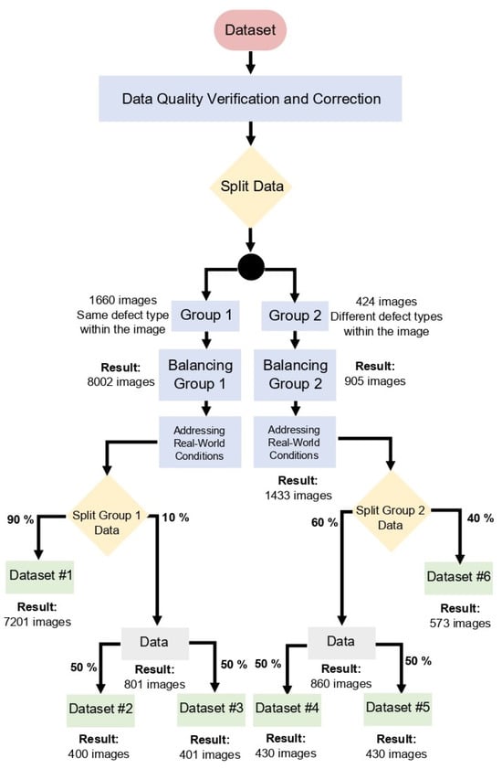 Subsequently, Group 1 is partitioned, with 90% forming Dataset #1, while the remaining 10% is distributed evenly to create Datasets #2 and #3. For Group 2, a similar stratification is suggested, with augmentations taking place, but also keeping the original unmodified images in the dataset, in order to increase the number of instances. The defect ‘waist folding’ is unique in that it does not co-occur with other defect types, so it is absent from Group 2, which comprises images with multiple defects. To address this, images from Group 1 with ‘waist folding’ undergo augmentation, resulting in 252 instances of this defect, which are then added to Group 2 for a more comprehensive representation of defect types across both groups (Figure 8b). So, the number of images in Group 2 after addressing real-world conditions is 1433. Subsequently, this group is partitioned, with 40% forming Dataset #6, while the remaining 60% is distributed evenly to create Datasets #4 and #5. This careful, detailed, pre-processing regimen is designed to prepare the data for rigorous experimental testing and investigation of fairness, bias and generalization.