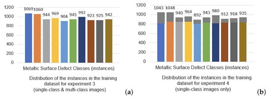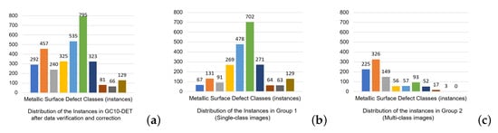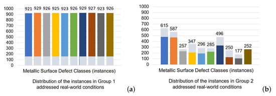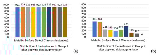 In addition to including rare and co-occurring defect classes, this dataset faces three prevalent issues: misclassified or incorrect labels, missing labels, and inconsistent labeling, so it is good practice to conduct a manual review and correction of the labels for each image to ensure accuracy and consistency. After this meticulous process, the dataset is refined to a total of 3243 instances, whose color labels are shown in Figure 5 and the resulting class (defect) distribution in the “cleaned” dataset before data balancing is shown in Figure 6a. Next, the dataset is split into two groups. Group 1 comprises 2265 instances with the same type of defect (as in Figure 4a), with the distribution across the various defect classes illustrated in Figure 6b. In contrast, Group 2 consists of 978 instances, each containing multiple, different defect types (as in Figure 4b), whose distribution is detailed in Figure 6c. Group 1 started with 1660 images, while Group 2 with 424 images, but a methodical balancing process augmented Group 1 from its original count to 8002 images, and Group 2 to 905 images. The distribution of instances in Group 1 and Group 2 after balancing is illustrated in Figure 7a and Figure 7b, respectively. This significant augmentation is achieved using horizontal flips, vertical flips, rotations at angles of 30, −30, 45, −45, 60, −60, and 90 degrees, random crops, and adjustments to image brightness to simulate darker conditions.