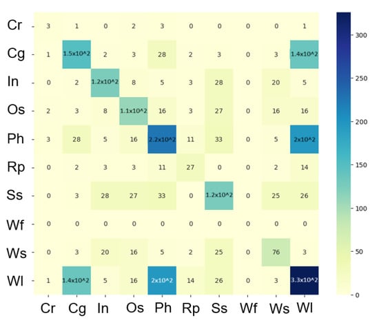 A pronounced co-occurrence is thus revealed between crescent gap (Cg) and welding line (Wl), as well as punching hole (Ph) and welding line (Wl), indicating these defects frequently appear together within the same samples. This strong relationship suggests a possible shared causal factor or a sequence in the manufacturing process that predisposes the occurrence of one defect when the other is present. Other moderate co-occurrence relationships are observed among different pairs of defects such as crescent gap (Cg) and punching hole (Ph), inclusion (In) with both silk spot (Ss) and water spot (Ws), and oil spot (Os) with silk spot (Ss), water spot (Ws), and welding line (Wl). These moderate co-occurrences suggest that, while these defects are less frequently associated, there is still a significant relational trend that warrants further investigation. The heatmap’s diagonal, which reflects the frequency of each individual defect type, revealed high values. This pattern is not only expected, but also vital for understanding the overall occurrence rate of each defect within the dataset. An intriguing aspect of the findings is the isolated occurrence of waist folding (Wf), which did not co-occur with any other defect type. This unique pattern highlights the distinct nature of waist folding (Wf) compared to other defects and may prompt a specialized inspection process. This study also points to potential skewness in the data. The disproportionate prevalence of certain defects, particularly welding line (Wl), suggests that some are overrepresented. This imbalance can have profound implications for training, as it may bias models towards overrepresented defects. Hence, there is a need for strategic approaches such as data augmentation or a rebalanced sampling technique to ensure a fair representation of all defect types.