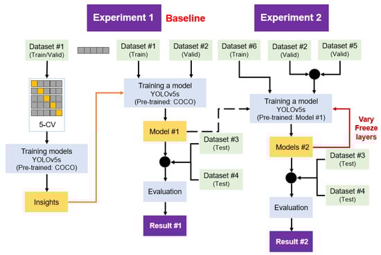 Data augmentation and hyperparameters throughout all experiments adhere to the default data augmentation techniques and hyperparameters for the training of YOLOv5s recommended by Jocher et al. in [], with specific modifications to accommodate our experimental design. The details of our experimental setup are listed in Table 1.