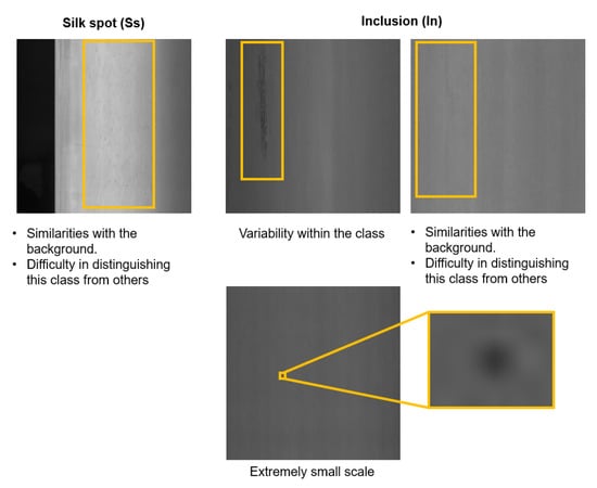 However, the model faces challenges with certain defects, particularly inclusion (In) and silk spot (Ss). These types consistently score lower across all evaluation metrics, indicating difficulties in accurately detecting them. This could be attributed to the complexity of these defects, their resemblance to non-defective areas, similarities with the background, variability within the class, or difficulty in distinguishing this class from others, or extremely small scale illustrated in Figure 11. The variable performance with defects like oil spot (Os), punching hole (Ph), and rolled pit (Rp) further suggests that while the model is capable of detecting these defects to a certain extent, there is notable room for improvement.