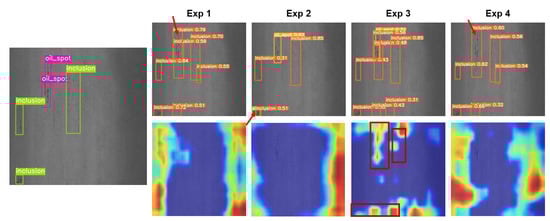 Explainability via Eigen Class Activation Mapping (Eigen-CAM): Eigen Class Activation Mapping [] is a model explainability tool tailored for convolutional neural networks (CNNs), aiming to elucidate how models interpret visual data to make predictions. Eigen-CAM serves as a qualitative indicator of the training process, helping determine the adequacy of training setups, the need for additional data augmentation, and identifying potential focus errors in the model’s predictions. Eigen-CAM stands out for its simplicity and easy integration, without the need for re-training or layer modifications. It computes and visualizes the principal components of features from convolutional layers, creating heatmaps overlaid on the input image, to highlight areas with the most significant layer activations. These visualizations can vary, showing heatmaps from different layers or a combined heatmap to underline the image’s overall focal points. Unlike class-specific techniques such as gradient-weighted class activation mapping (Grad-CAM), Eigen-CAM is a class-agnostic method that facilitates the visualization of features that CNNs leverage to make decisions, regardless of the classification output []. This is especially pertinent in our work, where multiple classes exist within single images, as it bypasses the need to segment explanations by class. Furthermore, Eigen-CAM is beneficial in circumventing the ambiguity that arises in multi-label scenarios where several defect classes may spatially overlap or closely interact within an image. Class-specific techniques can yield convoluted insights that are challenging to disentangle, whereas Eigen-CAM sidesteps this issue, providing a singular, coherent heatmap.