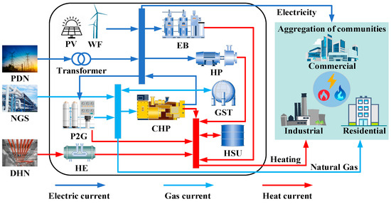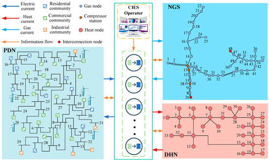 The PDN, DHN and NGS are generally operated to meet the energy demand by different enterprises, where operational independence must be considered. Based on the strong coupling characteristics of these three systems, CIES is proposed to perform overall collaborative dispatching without different energy systems’ fully disclosed operation data and models due to privacy protection. CIES, through the incorporation of prevalent energy production, conversion, and storage technologies like combined heat and power (CHP), heat pumps (HP), power-to-gas (P2G), electric boilers (EB), heat storage units (HSU), and gas storage tanks (GST), offers numerous advantages. It integrates various energy carriers to meet diverse community user demands, swiftly providing increased flexibility to address real-time energy supply-demand imbalances.