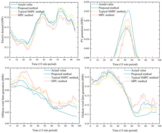 - The SMPC-based framework couples system dynamics, multiple uncertainty sources and day-ahead scheduling results. Analytically, an auto-regressive model is adopted to predict the future information of multiple uncertainty sources and the stochasticity of SMPC strategy is illustrated by using the scenario generation method. Concisely, both scheduling period and prediction horizon are considered in an uncertain environment. In addition, the penalty for deviation from pre-scheduled values obtained by day-ahead scheduling is considered to minimize the entire operation cost.