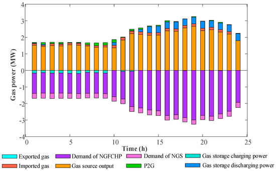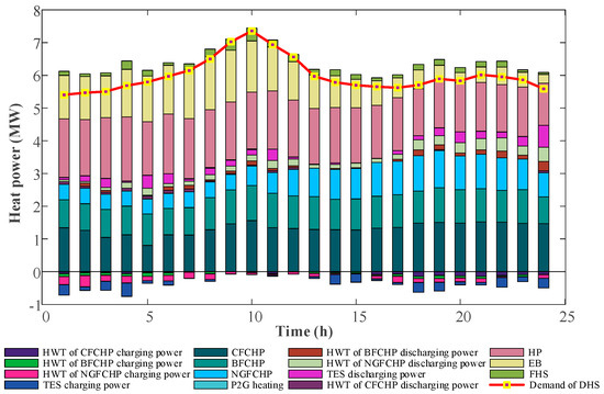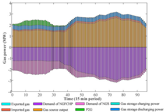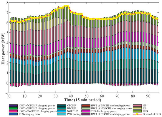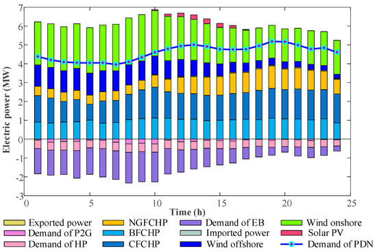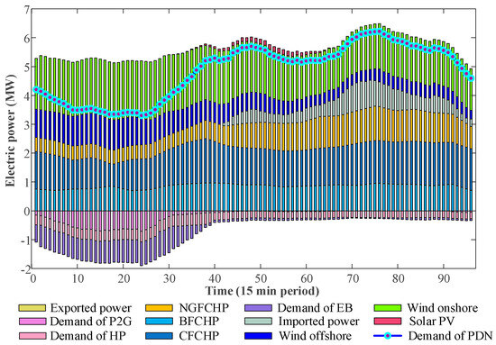 The total power provided by the CHP is calculated as a sum of DA value and regulating power. Moreover, coupling devices comprised of EB, HP and P2G units withdraw electrical energy from PDN.