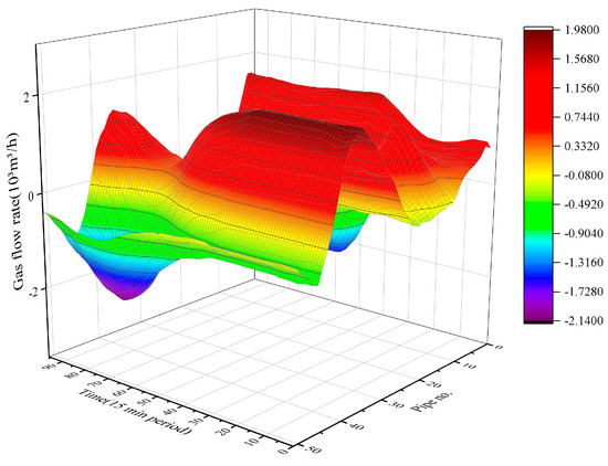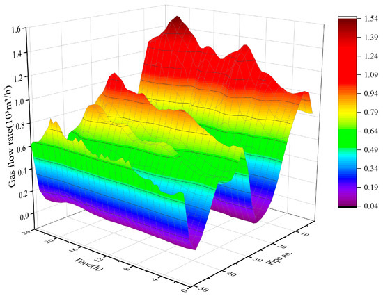 where is the diameter of the pipeline; is the molar gas constant; is the gas temperature; is the gas density under standard condition; and are the inlet and outlet gas flow rates of the pipe, respectively.