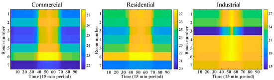 where is the wall temperature between neighboring node and ; is the thermal capacity of the wall between node and ; is the temperature of node ; represents the thermal resistance between node and ; indicates the set of nodes neighboring the wall; binary variable takes 0 for internal walls and 1 for external walls; and are the coefficient of radiative heat absorption and the surface area of the wall; is the radiative thermal energy that impinges on the wall.