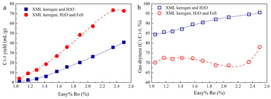 Figure 1 shows the yields of the gas products in the hydrothermal experiments. For comparison, the units used for the gas yields were converted to millilitres (mL) per gram of kerogen (mL/g). The equivalent vitrinite reflectance (Easy%Ro) for each sample was calculated based on the EASY%Ro kinetic model of Sweeney and Burnham [32]. With Easy%Ro from 1.05% to 2.50%, total HC gas (C1–5) yields in the pyrolysis of XML kerogen involving H2O (Group 1) and involving FeS and H2O (Group 2) gradually increased from 1.25 to 40.88 mL/g and from 4.08 to 72.87 mL/g, respectively (Figure 1a). Notably, the C2+ HC gas (C2–5) yield in the Group 2 experiments also becomes much higher than that in Group 1 (Table S1). For instance, the C2–5 yield in the Group 2 experiments reaches 1.22–21.82 mL/g, which is 6.3–11.4 times that in the Group 1 experiments (0.19–1.91 mL/g). In addition, gas dryness (C1/C1–5) in the Group 2 experiments is apparently lower compared with that in Group 1 (Figure 1b).