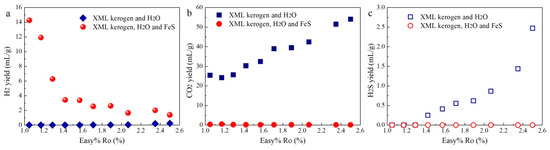H2 yields in Group 1 and Group 2 experiments are 0.006–0.23 mL/g and 1.38–14.27 mL/g, respectively (Figure 2a). The yields of carbon dioxide (CO2) in the Group 1 experiment are 24.19–54.05 mL/g (Figure 2b). The decomposition of the C-O groups in the OM structures and H2O–OM reactions at elevated temperatures may collectively contribute to the generation of CO2 during the pyrolysis of kerogen with H2O [7]. Certain amounts of H2S were also generated at Easy%Ro > 1.42% in the Group 1 experiments (Figure 2c). However, CO2 yield became extremely low, and there was no detectable H2S in the Group 2 experiments.