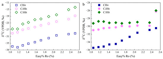 δ13C distribution for C1, C2, and C3 at different Easy%Ro in the hydrothermal experiments without (a) and with FeS (b).