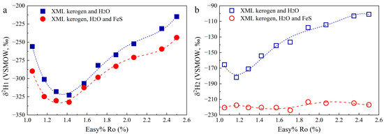 As mentioned above, H2 was first generated from redox reactions involving H2O-FeS and then participated in the hydrogenation of OM in the Group 2 experiments. In this process, there is H isotope fractionation for the H2O-H2-CH4 system [16]. The EIE factors for H fractionation of H2O-H2 (αH2O-H2) and CH4-H2 (αCH4-H2) are expressed through the use of Equations (12) and (13).