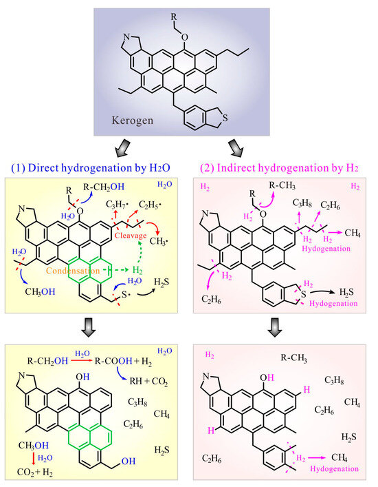 In summary, the hydrogenation of OM by H2O contributing to HC generation mainly includes two pathways. One is the direct H2O-OM reaction involving H2O and OM with/without catalysts (“the direct hydrogenation”) [2,7,9]. Till now, the mechanisms for H2O-OM reactions have been well understood due to experiments [6,7,8]. Direct hydrogenation was interpreted as having either a free radical or ionic mechanism [2,5,6,7,8,9,10,11,12]. For the free radical mechanism, the capture of alkyl free radicals from the homo-cleavage of OM by •H from H2O is responsible for the release of lower-molecular-weight HCs [7,8]. Meanwhile, the incorporation of •OH with alkyl groups generates carbon dioxide (CO2). Alternatively, the ionic reaction between intermediate alkenes and H+ from H2O dissociation also occurs in H2O-OM reactions, leading to isomeric HC generation [10]. Particular minerals (i.e., clay) may act as favorable catalysts for ionic reactions [8,9,10]. In addition, C/H isotope fractionation for HC gas generation from H2O-OM reactions has been discussed in previous studies [9,10,11,12,13]. H exchange or transfer from H2O to OM and HCs could occur in H2O-OM reactions [9,13,14,15,16,17]. It has been suggested that the H transfer from H2O accounts for the 2H isotope rollover of CH4 (i.e., δ2H becomes more negative with maturity or depth increasing) in natural gas at high maturity [18].