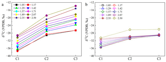 The calculated δ13C1,H, δ13C2,H, and δ13C3,H from hydrogenation by H2 range from −34.6‰ to −33.3‰, from −31.7‰ to −31.3‰, and from −29.7‰ to −29.0‰, respectively (Figure 7a). For equilibrium 13C fractionation in Reactions (5)–(7), the difference in δ13C (Δδ13C) between the precursors of alkyl chains in OM (δ13Cal) and HC gases (δ13Ci) can be addressed through the application of Equation (11).