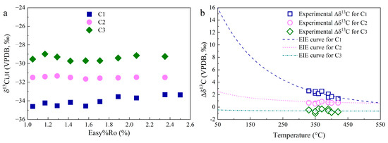 Based on the ab initio quantum calculation using the B3LYP-631G** flavor of DFT, the αEIE for the 13C exchange involving CH4, C2H6, and C3H8 at 50–550 °C were addressed as 1.0158–1.0004, 1.0025–1.0006, and 0.9995–0.9993, respectively. According to Equation (10), the Δδ13C values are calculated from 15.7‰ to 0.7‰, from 2.5‰ to 0.6‰, and from −0.5‰ to −0.7‰ (Figure 7b). Intramolecular equilibrium 13C fractionation suggests that the alkyl groups in OM are more depleted in 13C compared with the aromatic C and C-O groups [39]. In addition, the EIE factor of 13C between the -CH2- groups and CH3 is higher than 1. This means that the δ13C of the alkyl chains should be more negative than bulk kerogen and increase with chain length. Taking the δ13C of methyl, ethyl, and propyl in XML kerogen as −32.0‰, −31.0‰, and −30‰, the calculated Δδ13C for CH4, C2H6, and C3H8 from the experimental data fit well with the theoretical curves. Therefore, EIE in the hydrogenation of OM by H2 may account for the small fractionation of δ13C between CH4, C2H6, and C3H8 in the Group 2 experiments.