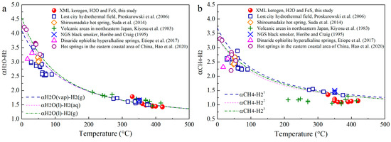 Previous experiments and theoretical calculations have addressed αH2O-H2 and αCH4-H2 as 4.54–1.36 and 3.68–1.21 at 0–500 °C [16,41,42]. Based on Equations (12) and (13), αH2O-H2 and αCH4-H2 in terms of measured δ2H of CH4 and H2 in Group 2 experiments were calculated as 1.79–1.42 and 1.35–1.10 (Figure 8). In hydrothermal systems, the occurrence of H2-rich fluids/gases has been extensively documented [16,23,40,41,42,43,44,45]. The redox reaction involving Fe(II)-minerals and H2O is considered as the most important pathway for natural H2 generation [22,23,24]. Kinetic calculations have revealed that the 2H exchange between H2O and H2O-derived H2 can reach equilibrium in a short time at high T [42]. This may be the reason that αH2O-H2 obtained from our experimental data fit well with the theoretical curves. Actually, the T-dependent H isotope equilibrium involving H2-H2O has usually been used as a temperature indicator for H2 generation in geological settings [40,42,44]. Considering the equilibrium H isotope exchange, previous studies have established a diagram of 1000lnαH2-H2O versus 1000lnαCH4-H2O to distinguish CH4 generation from the direct hydrogenation via H2O or from indirect hydrogenation via H2 [27,40]. Noticeably, when using this diagram to identify the origin of CH4 from hydrogenation via H2, two critical issues should be firstly addressed: (1) H2 is the dominant H source for CH4, and (2) the H isotope fractionation of H2-CH4 reaches equilibrium. As shown in Figure 8b, the experimental αCH4-H2 from the Group 2 experiments and some geological αCH4-H2 values deviate from the theoretical curves. Such a discrepancy may be interpreted by other H sources (i.e., OM and H2O) in addition to H2, which significantly contributes to CH4 generation.