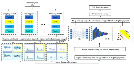 This section presents a diagnostic model for diaphragm pump failures, one which utilizes deep learning techniques and integrates the multi-source information fusion of vibration signals. The model framework, illustrated in Figure 1, comprises four main components: multi-source data collection, multi-source feature extraction, training and optimization of deep learning models, and decision-level multimodal fusion.